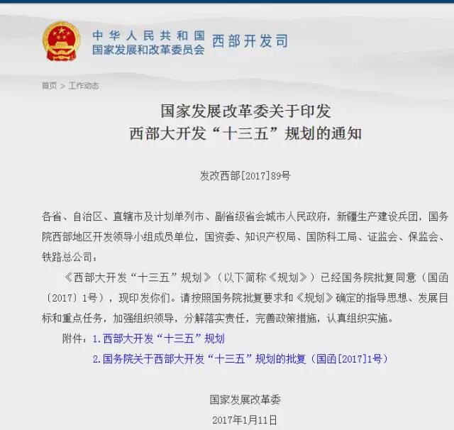 2017年,国家发改委网站发布《西部大开发“十三五”规划》,明确了未来几年西部地区的重点工程项目。