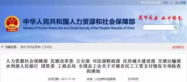 日前,人社部、国家发改委、公安部等12个部门印发通知,决定从2017年12月1日至2018年春节前,在全国组织开展农民工工资支付情况专项检查。其中,地方政府投资工程项目因拖欠工程款导致欠薪的,要在2017年底前优先全部清偿,切实维护广大农民工的工资报酬权益。