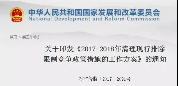 关于印发《2017-2018年清理现行排除限制竞争政策措施的工作方案》的通知