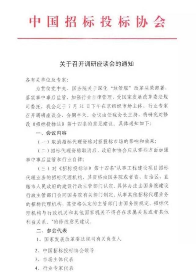 之前中国招标投标协会受国家发改委法规司委托组织市场主体、业内专家学者,就《招标投标法》第十四条关于工程招标代理机构资质管理的条款修订收集意见。